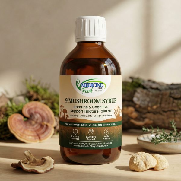 • Premium multi‑mushroom herbal syrup with warming botanicals.